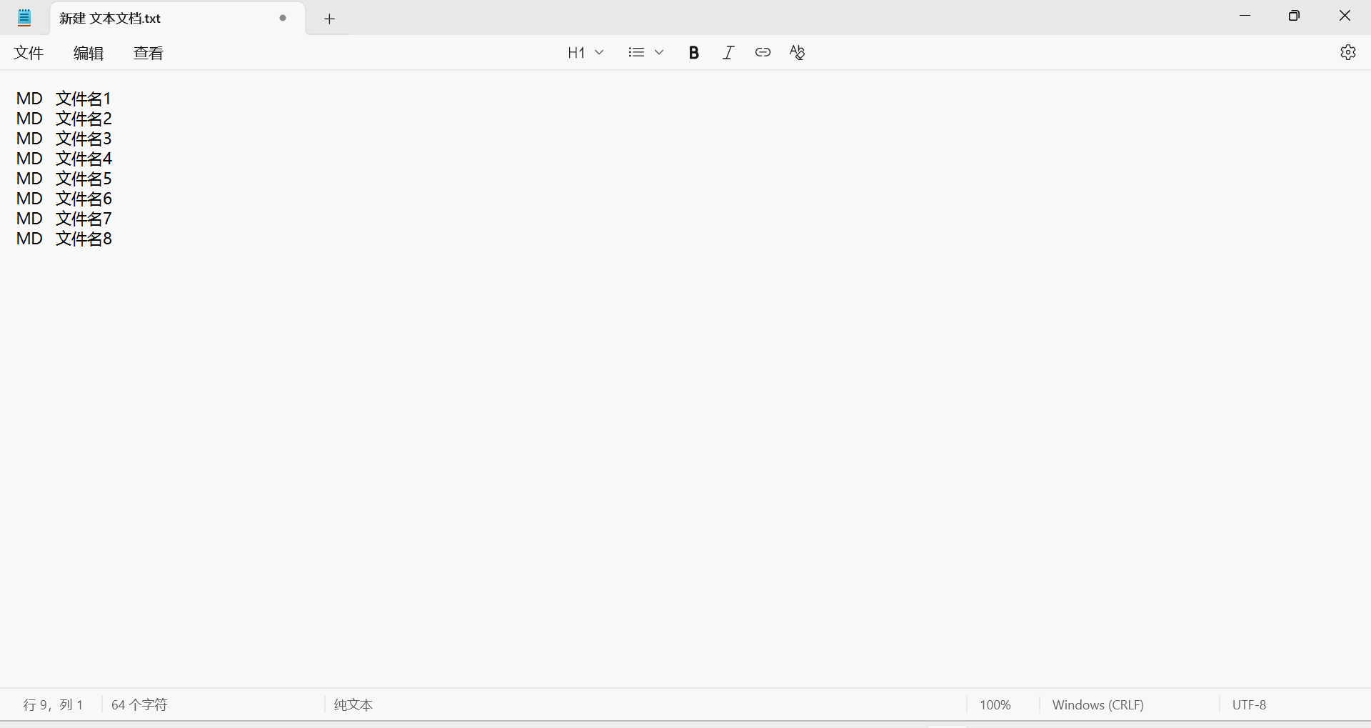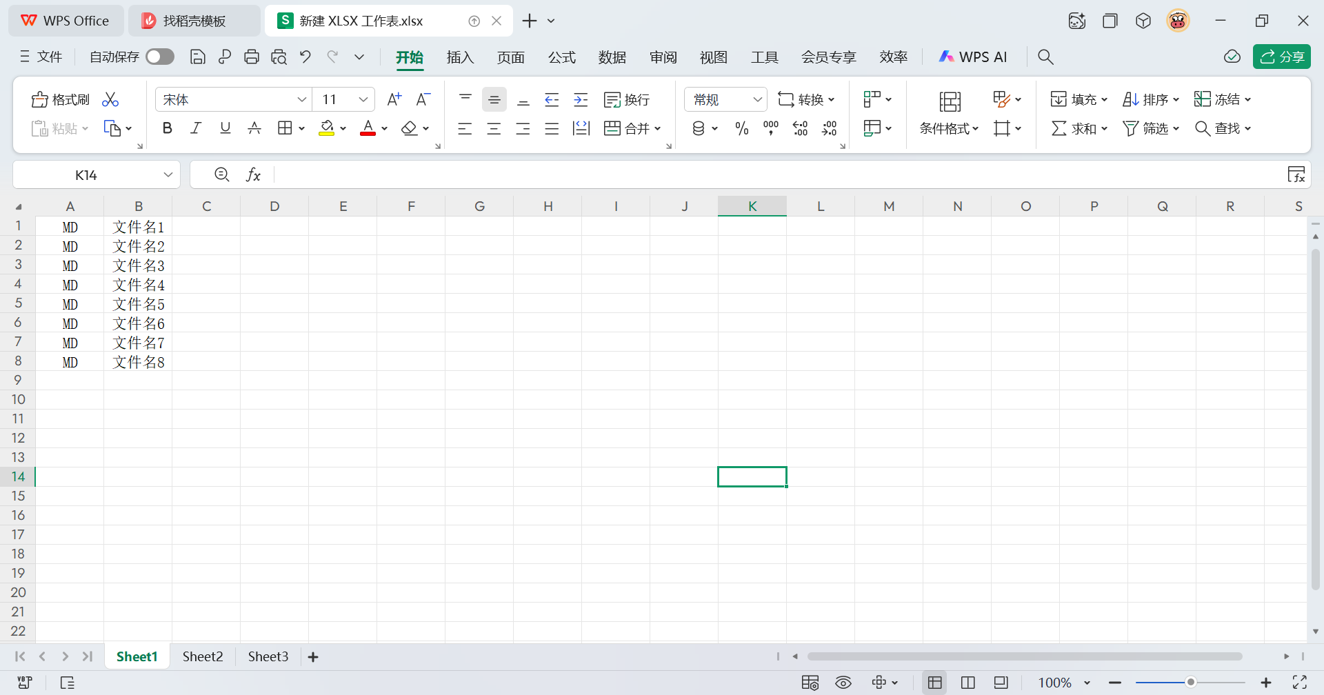1)新建Excel,第一列内容填写MD,第二列内容填写创建文件夹的名字
