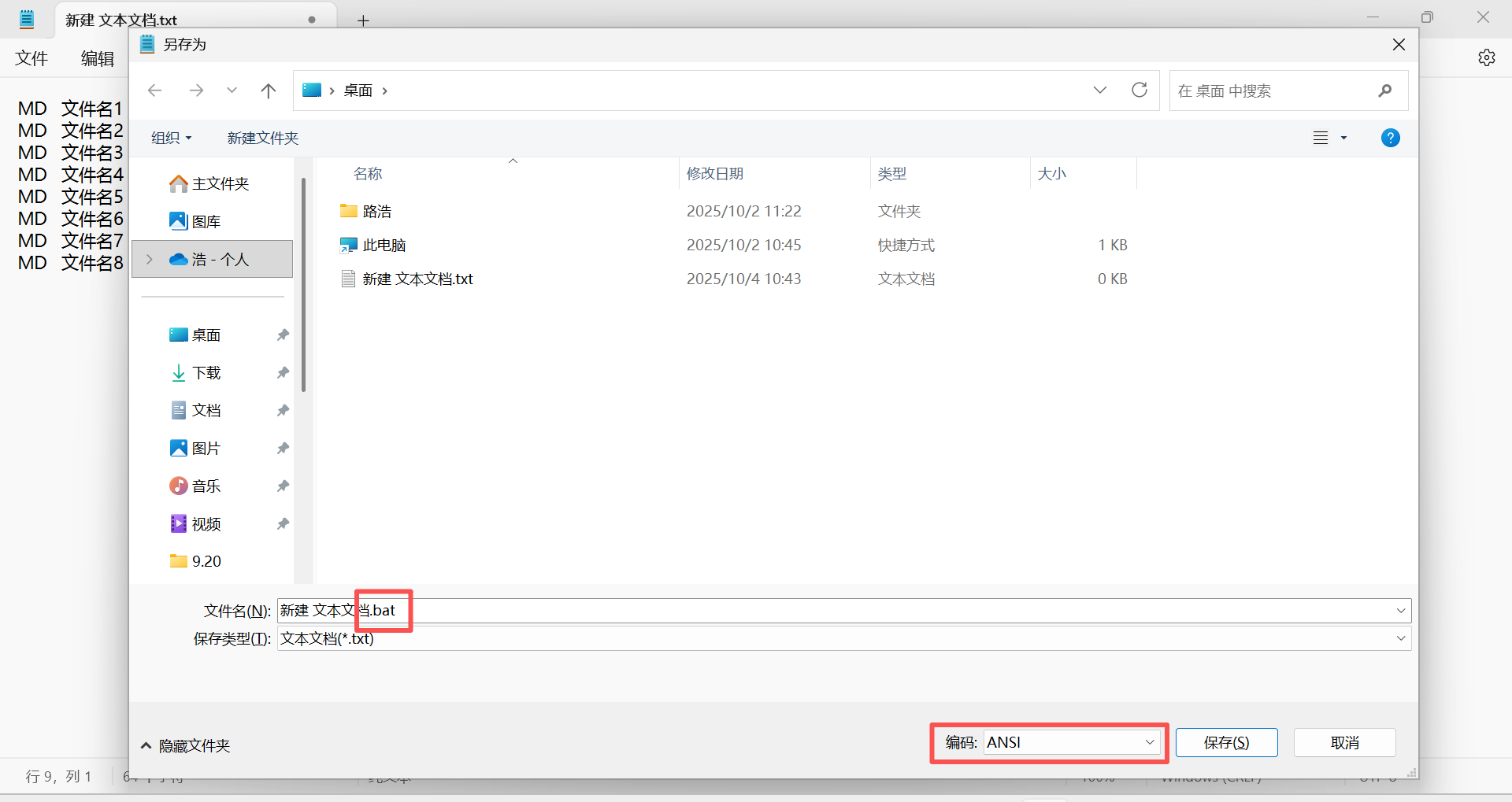 3)文本文档另存,文件名后缀修改bat,编码修改为ANSI,保存